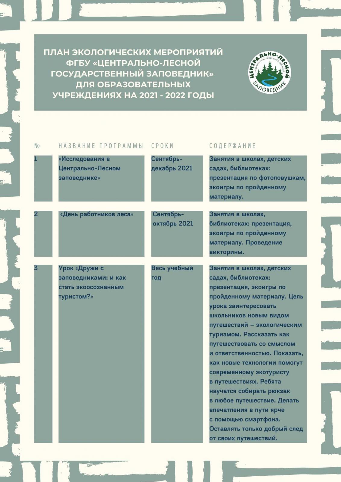 План экологических мероприятий ФГБУ «Центрально-Лесной государственный заповедник» для образовательных учреждений на 2021 - 2022 годы
