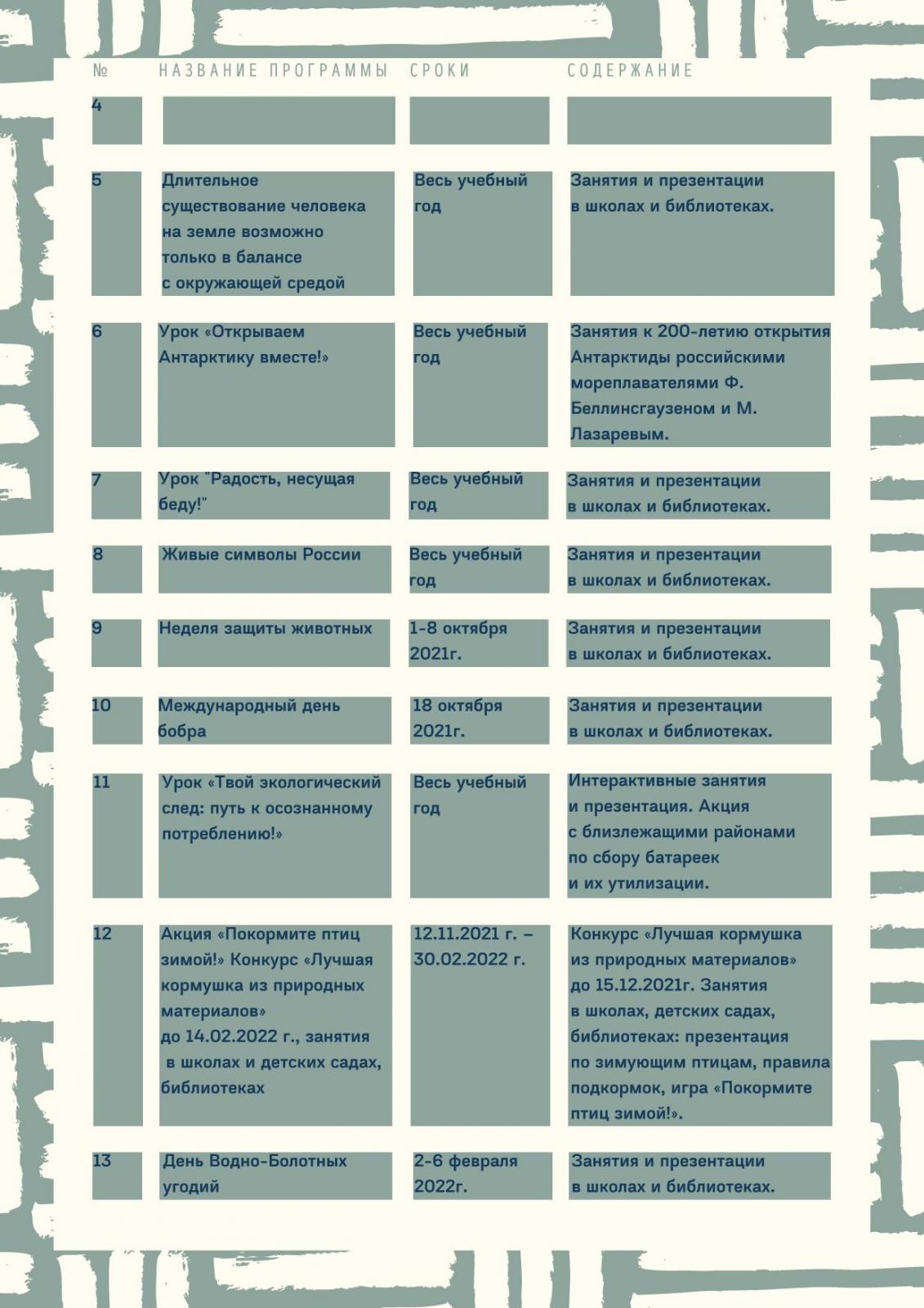 | 5 | «Длительное существование человека на земле возможно только в балансе с окружающей средой» | Весь учебный год | Занятия и презентации в школах и библиотеках. |