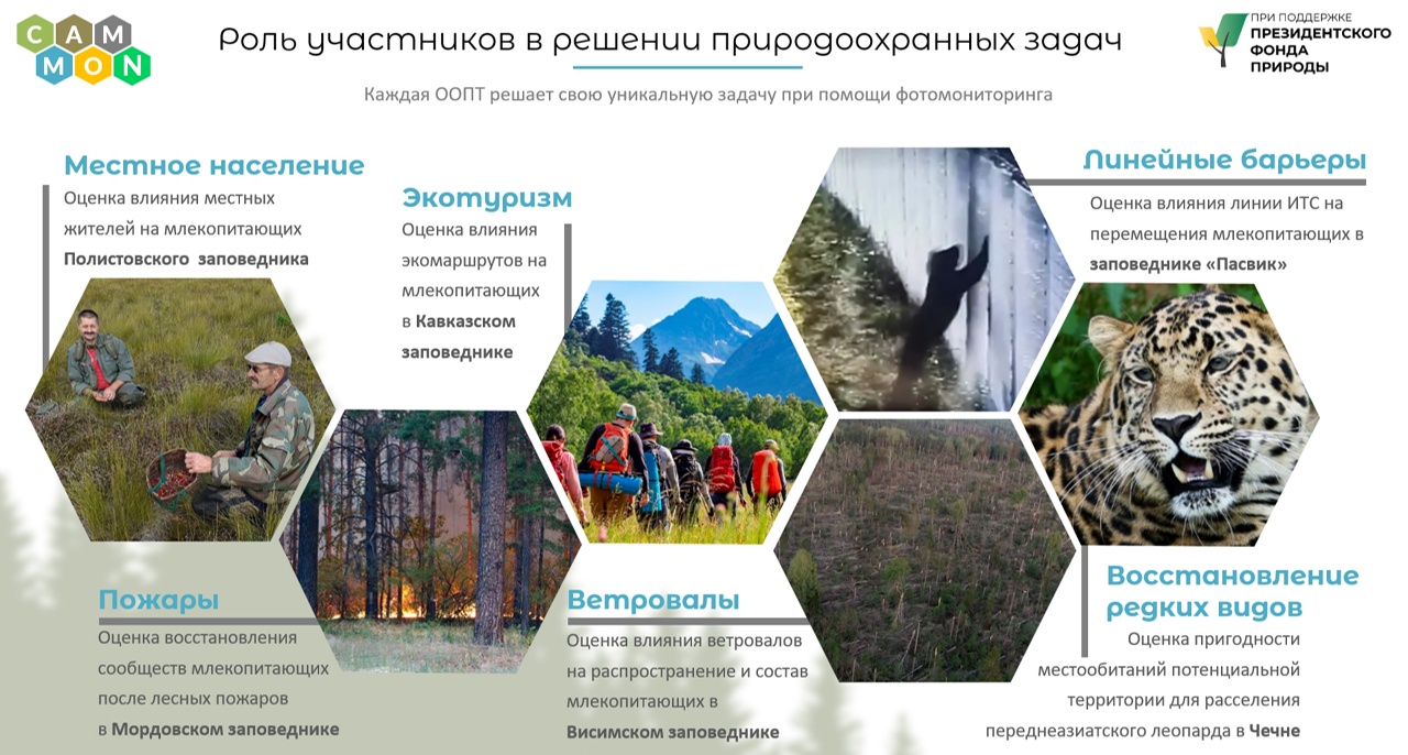 Каждая из 7 ООПТ будет решать свои задачи в рамках проекта. Полистовский заповедник организует взаимодействие с местными жителями через оценку их влияния на млекопитающих заповедника и охранной зоны. Мордовский заповедник начнет наблюдения за восстановлением сообществ млекопитающих после пожаров. Заповедник "Пасвик" оценит влияние инженерно-технических сооружений на перемещение млекопитающих. Висимский заповедник узнает, как ветровалы воздействуют на популяции млекопитающих мозаичных ландшафтов Среднеуральского низкогорья. Кавказский заповедник сможет наблюдать влияние массового туризма и курортной застройки на млекопитающих и разработает механизмы для смягчения их последствий. Федеральный заказник "Советский" под кураторством Института проблем экологии и эволюции им. А.Н. Северцова РАН оценит потенциал пригодности местообитаний для реинтродукции переднеазиатского леопарда в рамках программы его восстановления на российском Кавказе. Важно, что все они будут работать по единой методике, активно обмениваться данными друг с другом и публично озвучивать успехи, сложности и результаты наблюдений по ходу проекта.