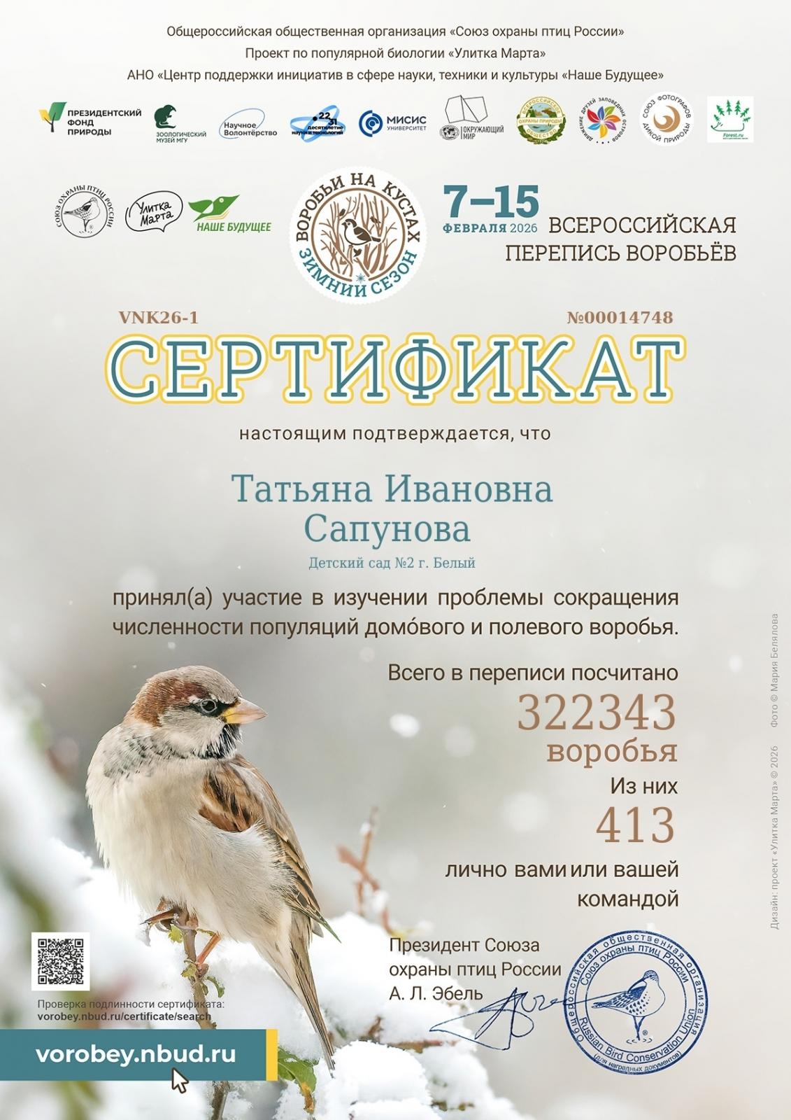 Всего в переписи участвовали 22639 человек из 87 регионов России, в том числе и Тверская область. Участниками было обследовано 14188 точек пребывания воробьев. Всего учётчики насчитали 322343 особи! Основная задача зимнего сезона-2026 – проверка известных мест, где ранее отмечались воробьи (учёты 2023-2025 гг.), а также поиск новых.