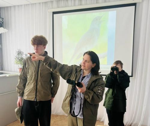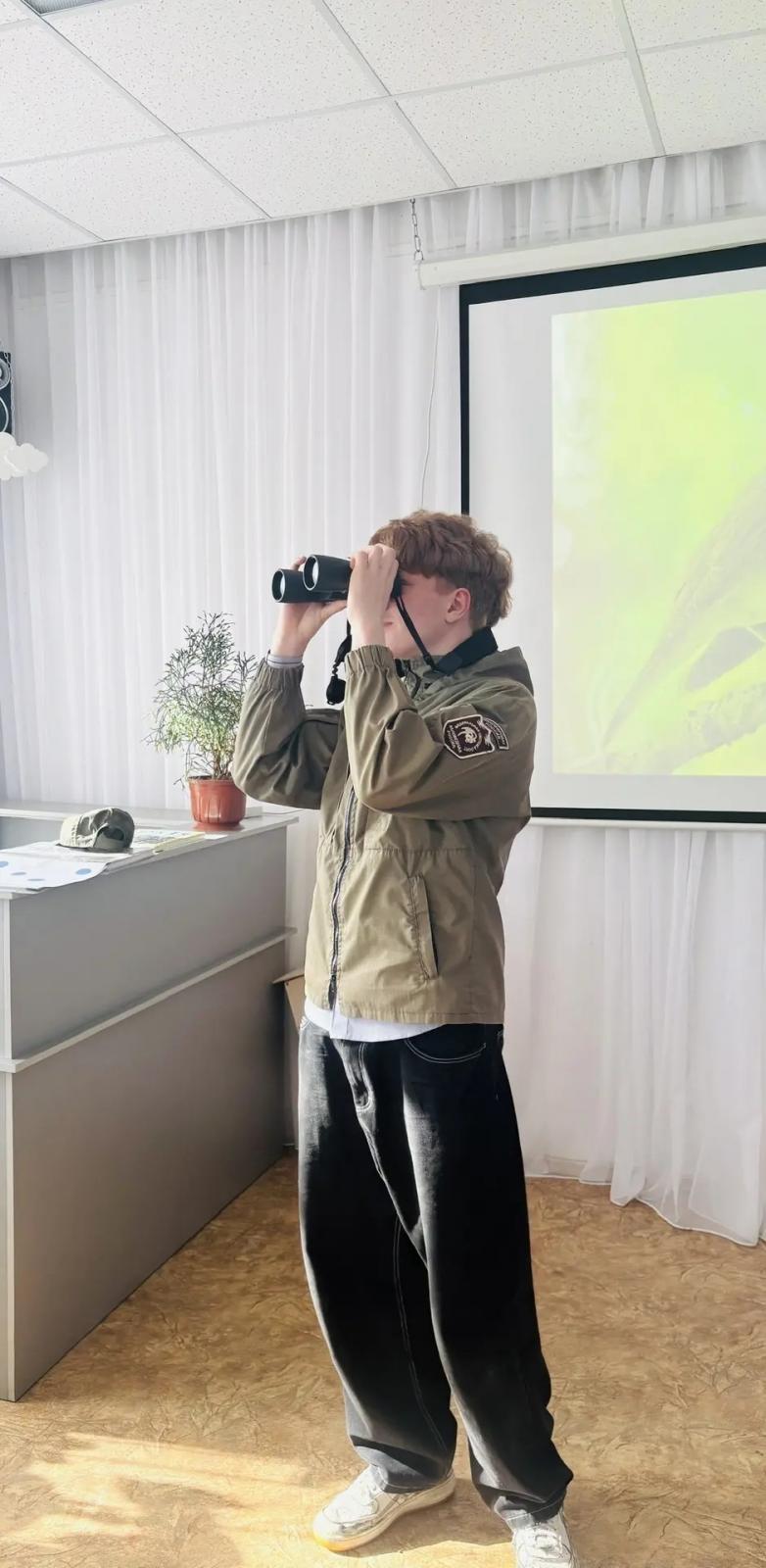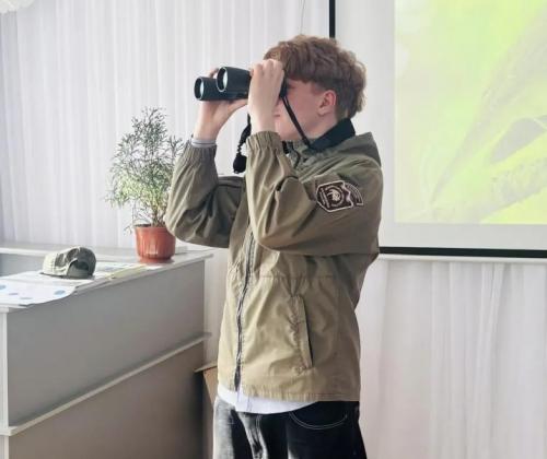 Сложнее было рассказать про деятельность научных сотрудников и сферах их работы. Помог Международный день птиц, отмечаемый 1 апреля - он определил направление разговора. Воспитанники научились распознавать пернатых друзей по голосу, считать их в полёте, определять расстояние до птиц. Ребята узнали, кто такой учёный-орнитолог, познакомились (пока что в теории) с трудностями полевых исследований. Каждый из ребят потренировался в наблюдениях с биноклем и смог примерить полевой костюм.