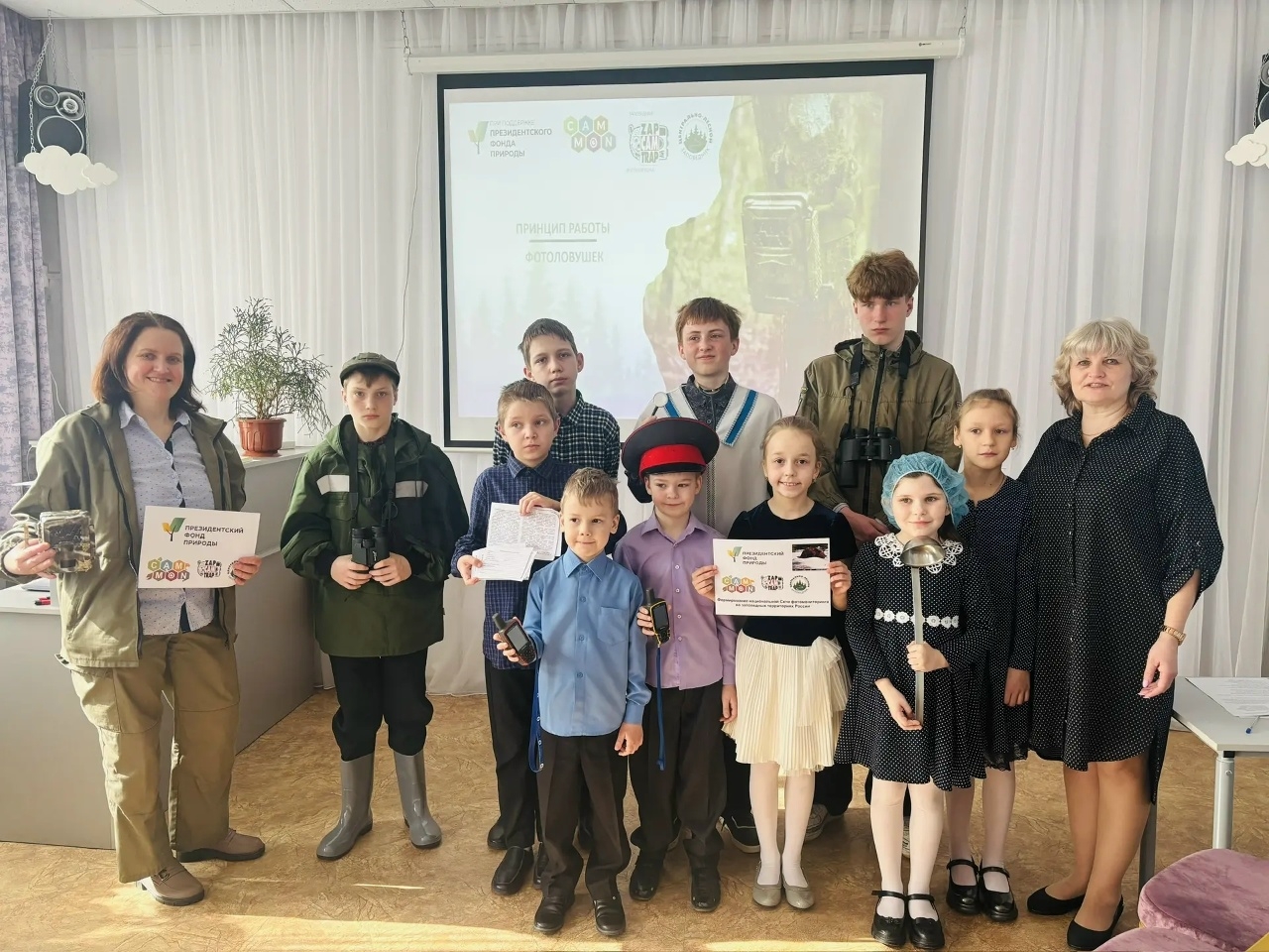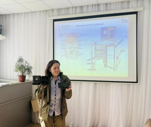 Помимо этого, воспитанники Центра посмотрели фотографии и видеосюжеты про животных, созданные при помощи фотоловушек. Елена Шуйская рассказала про проект Президентского фонда природы «Формирование национальной Сети фотомониторинга на заповедных территориях России», который осуществляется с 2025 г. при участии Центрально-Лесного заповедника на семи крупных ООПТ. Ребята увидели разные модели фотоловушек, а самые смелые попробовали привести камеры в рабочее состояние и установить их. Непростым делом оказалось прочитать нужную информацию с множества фотоснимков: тут требуются знания и опыт.