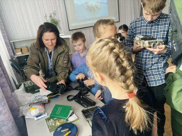 Нелёгкой задачей было рассказать про все заповедные профессии сразу, поэтому Елена привезла себе в помощь видеоролики про Центрально-Лесной заповедник, форму госинспектора в области охраны окружающей среды, полевой костюм научного специалиста, а также разные приборы, которые помогают изучать жизнь животных. Ребята посмотрели видеоролик о деятельности отдела охраны, примерили костюм и узнали обо всех нюансах профессии госинспектора.