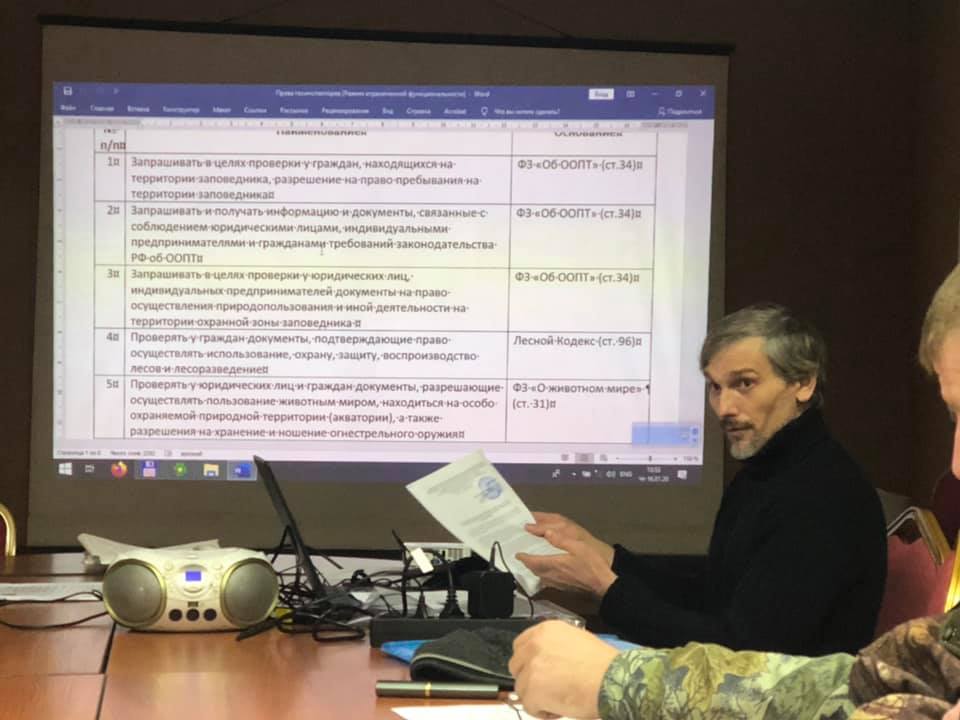 Чтобы государственный инспектор заповедника всегда чувствовал себя уверенно, ему необходимо регулярно обновлять свой багаж экоправовой информации. Именно поэтому у нас, как и на других заповедных территориях, с определенной периодичностью проходит обучение сотрудников. Такой обучающий семинар состоялся в центральной усадьбе ЦЛГЗ 16-17 января. На нем встретились сотрудники обоих лесничеств заповедника – Северного и Южного. Так как они дислоцируются в разных населенных пунктах, обучающие Мероприятия, акции и конкурсы – еще один хороший повод пообщаться и обсудить рабочие вопросы. На семинаре рассматривались вопросы природоохранного законодательства, прав госинспекторов, грамотного составления первичной документации. Использовались методические материалы эксперта «Гринпис» Михаила Крейндлина, за что ему большое спасибо! Здорово, что государственная и общественная структуры могут оказать друг другу реальную помощь в общем деле охраны природы.