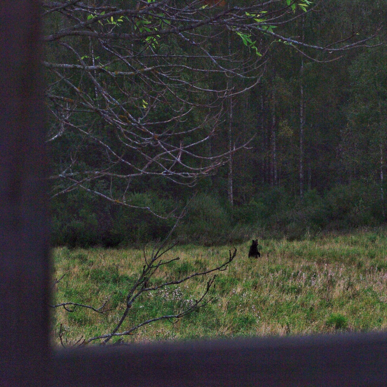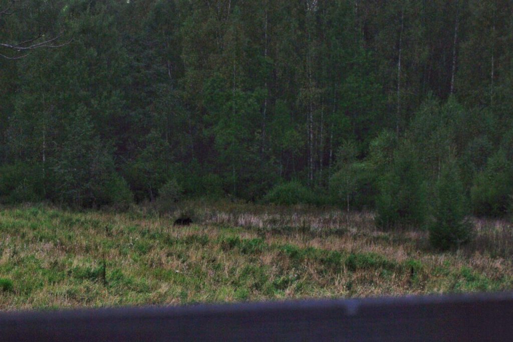 Забрались на вышку. Устроились на досточке, приспособленной для сиденья. Точно воробушки, на телеграфном проводе или там попугаи на ветке. Сидим, рассматриваем овес. Медитативное занятие. Молчим. Сколько так просидели, не знаю. Вроде не долго. Пссс, и меня толкнули в бок. Устремив взгляд по направлению пальца, сперва ничего не увидел. А потом из овса появилась медвежья голова, а рядом другая. Похоже, это были медвежата. Попробовал их сфотографировать. Но с собой был фикс полтинник, на кропе это миллиметров 80 будет, и их не хватало. Тут бы телевик 200 мм и дело было б в шляпе, но его я в отпуск с собой не взял. Ну, не знал я, когда уезжал, что пойду на медведя. Оставалась одна надежда на то, что медвежата подойду ближе к вышке. Побегав по кромке поля, звери скрылись в лесу. И тут в нас проснулся азарт. Очень хотелось, чтобы медвежата вернулись и подошли ближе. Из леса доносились непонятные звуки. Такое ощущение, что кто-то скребется. Потом наступила тишина. Сидим, ждем. Через какое-то время со стороны ближней к нам границы леса снова раздались какие-то не очень понятные звуки. Повернув головы, мы увидели, как по полю идет медведь. А у кромки леса его ждут медвежата. «Медведица» - сообразили мы. В какой-то момент она, видимо, учуяла нас на вышке, остановилась и посмотрела в нашу сторону. Адреналин? Да, был. Ну не то, чтобы вот прям, скорей больше азарт наблюдателя, которому повезло. Приятно же. Проехать километров четыреста до заповедника, увидеть медведя в естественной среде обитания, да еще и сфотографировать его. На наших глазах медвежья семья воссоединилась и скрылась в лесу. Мы еще чуть-чуть посидели, подождали. Но из леса больше никто не появился. Решили, что и нам пора возвращаться в деревню. Спускаясь с вышки, стали громко разговаривать, обозначив себя, на случай если звери бродят у кромки поля.