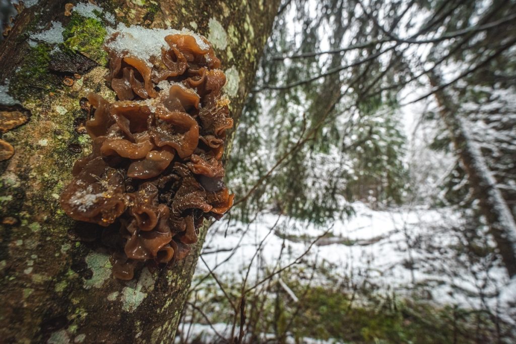 Все привыкли, что зимой, обычно, из грибов можно увидеть только крепкие трутовики и черные, как угли, чаги. Однако кроме них, в конце осени-начале зимы появляются интересные виды «мягких» грибов, плодовые тела которых сохраняются до сильных морозов. Первый гриб – опенок зимний, довольно распространенный вид, растущий на мертвых или ослабленных лиственных деревьях и пнях, интересен тем, что может плодоносить в течение всей зимы. Основная роль гриба – разложение мертвой древесины. Второй гриб, дрожалка лиственная, более необычен, поскольку, в отличие от других грибов, растущих на деревьях, паразитирует не на них, а на мицелии дереворазрушающего гриба стереума.