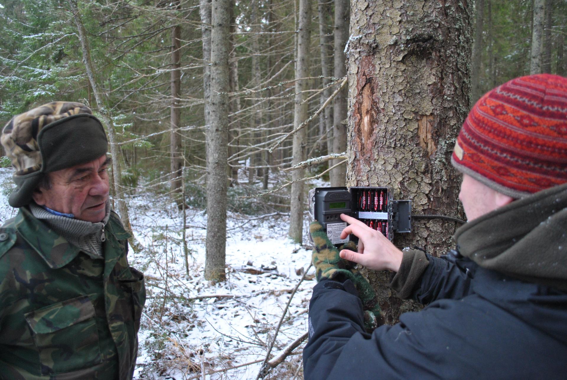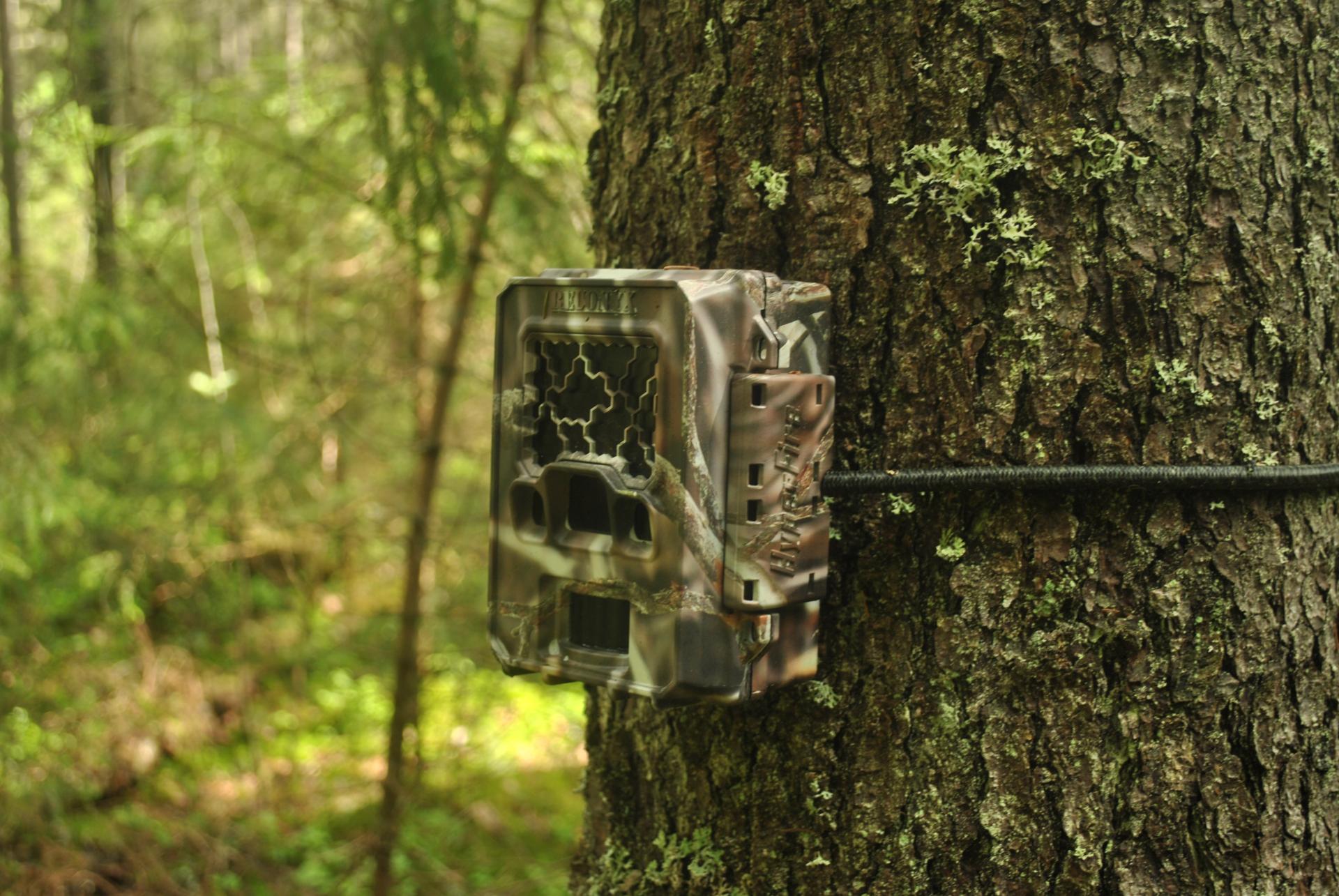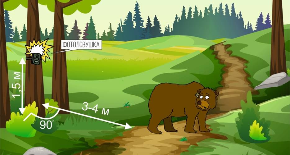 В лесу фотоловушки крепятся на стволах деревьев на высоте от 70 до 150 см от уровня земли. Чаще всего для этого выбираются ели, которые очень удобны для установки камер. Фотоловушка должна быть направлена на просеку, лесную дорогу или звериную тропу – место, где вероятность прохода животных максимально высокая. Дерево должно находиться примерно в 3-4 м от такой тропы (не далее 8 м), чтобы даже такие крупные звери, как лоси или медведи, целиком попадали в кадр. Важным условием является угол направления камеры – прибор должен быть сориентирован перпендикулярно направлению движения животных. Все это повышает шансы обнаружения диких зверей и получения качественных снимков.