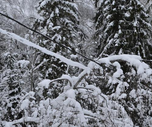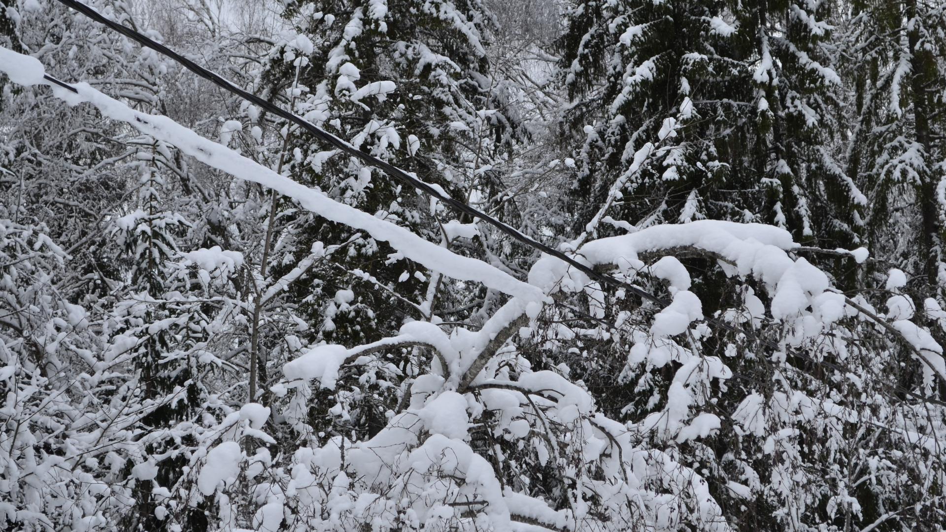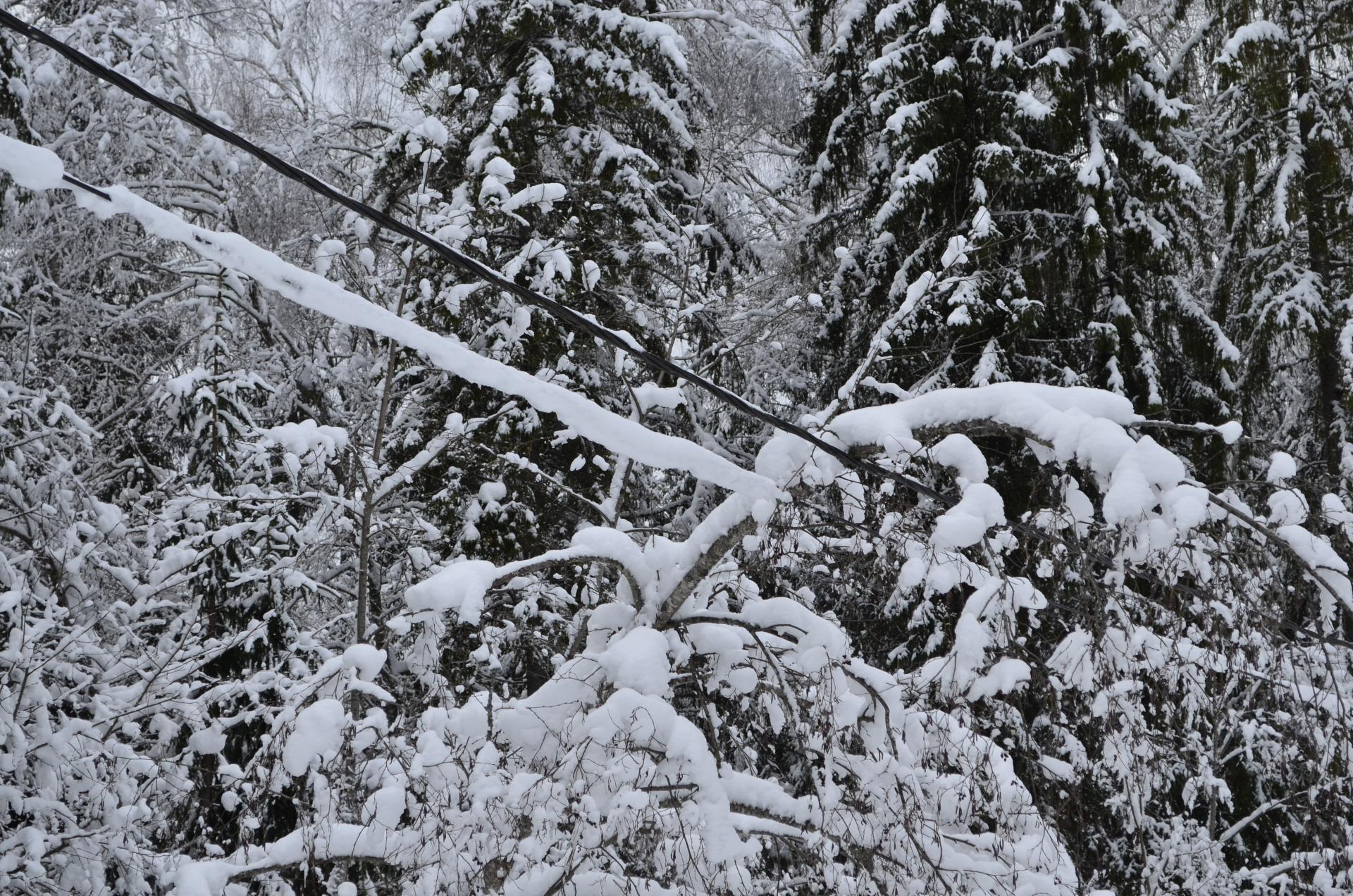 Сильный снегопад стал причиной мощного налипания мокрого снега на линиях электропередач и деревьях, в результате чего произошел обрыв проводов и снеголом деревьев.