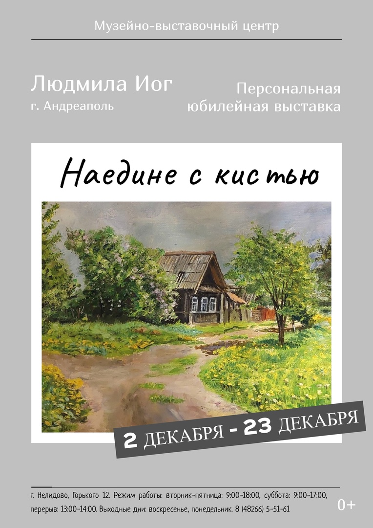 2 декабря в Музейном выставочном центре г. Нелидово состоялось открытие персональной выставки «Наедине с кистью» Людмилы Юрьевны Иог. Этот день был необычным для художницы из г. Андреаполь. Людмила отмечала свое 60-летие.