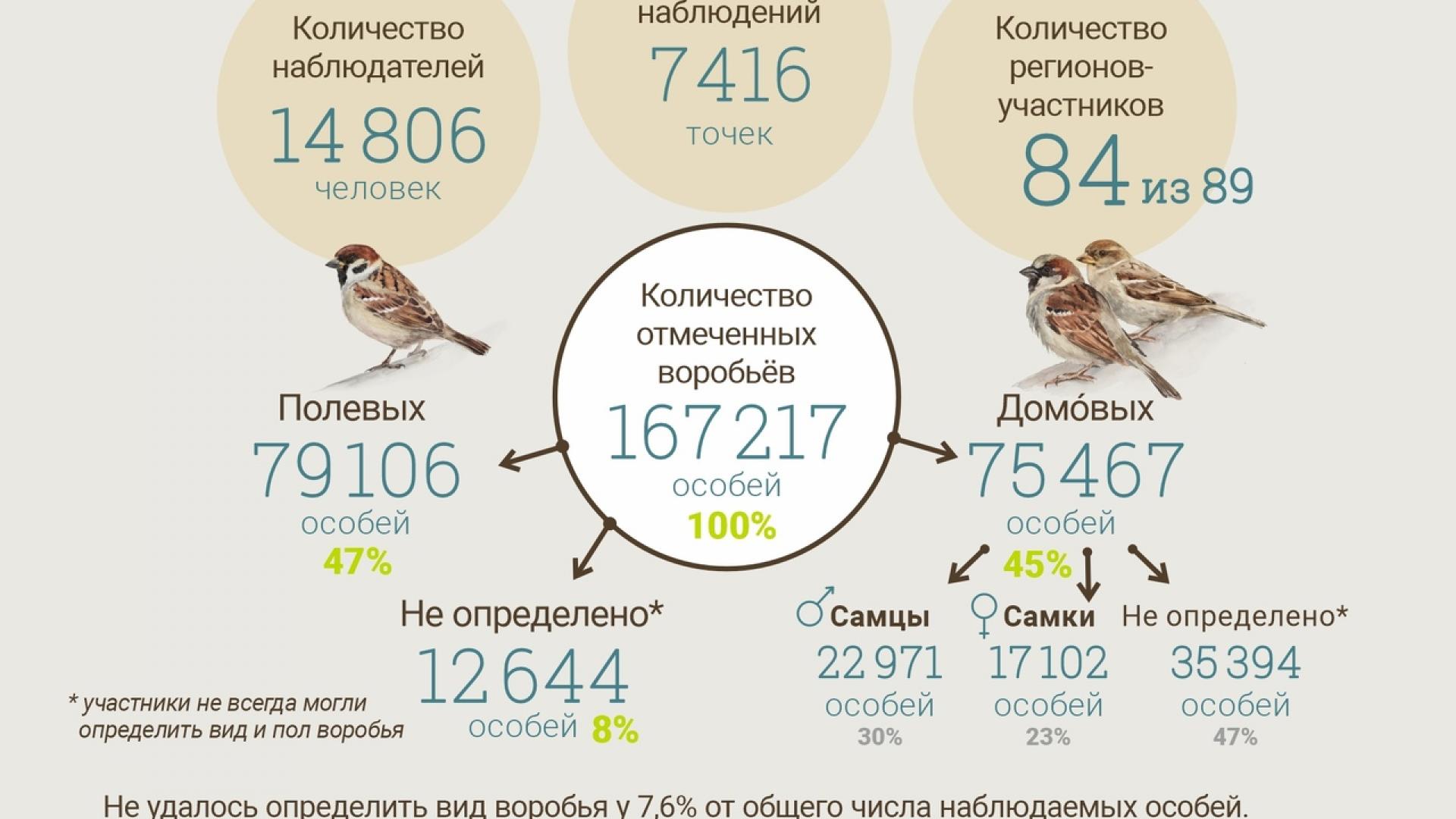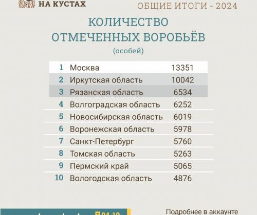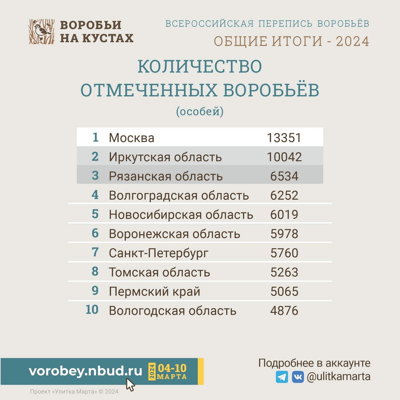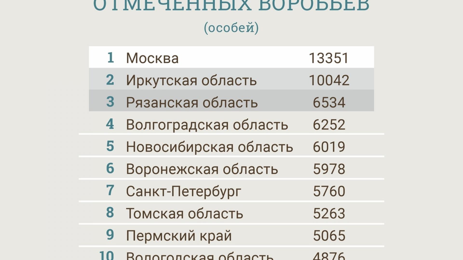 насчитав 3645 воробьёв. Лидером в учётах стали г. Москва (13351 особь), Иркутская