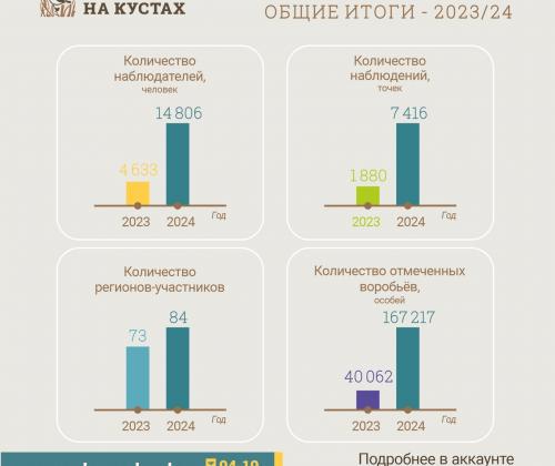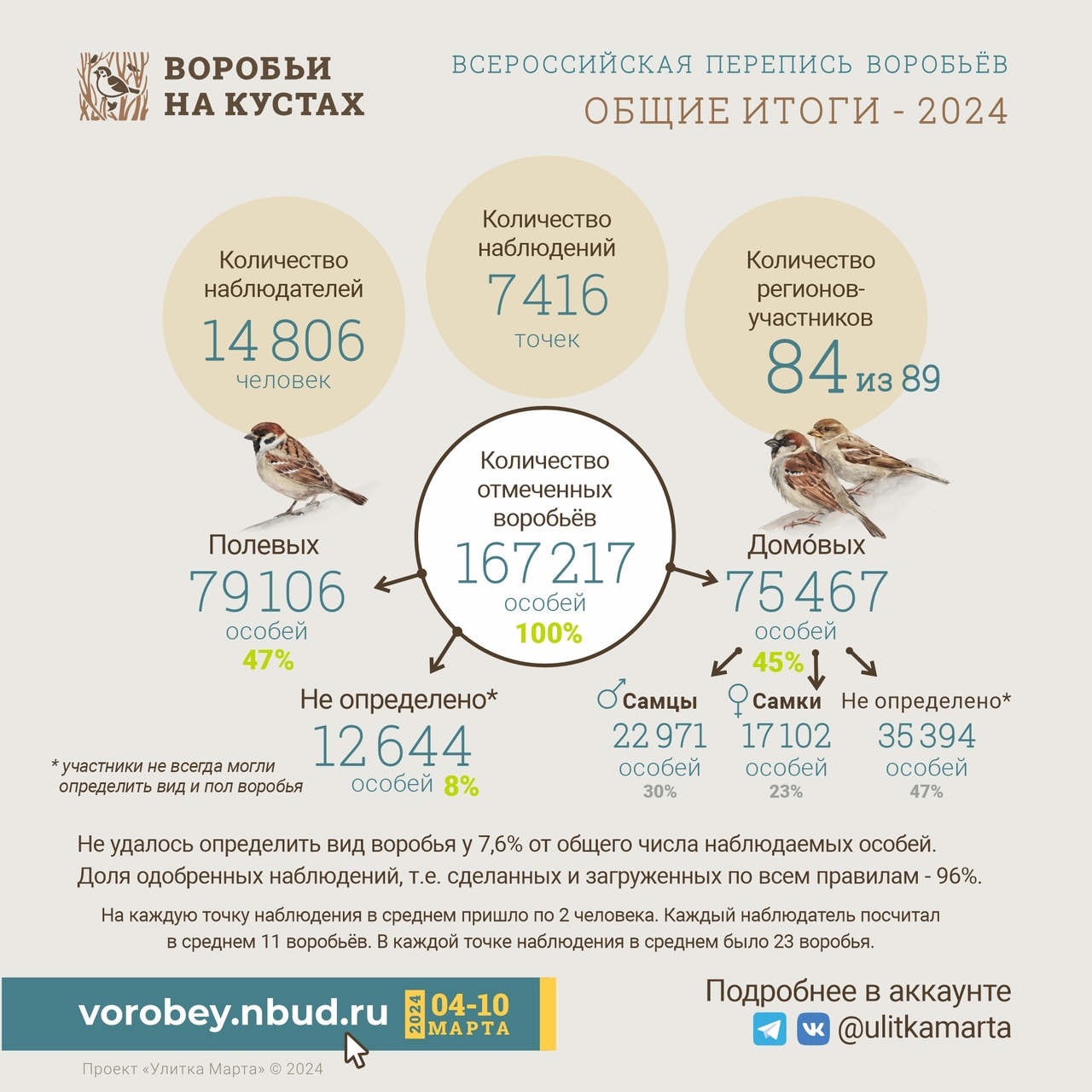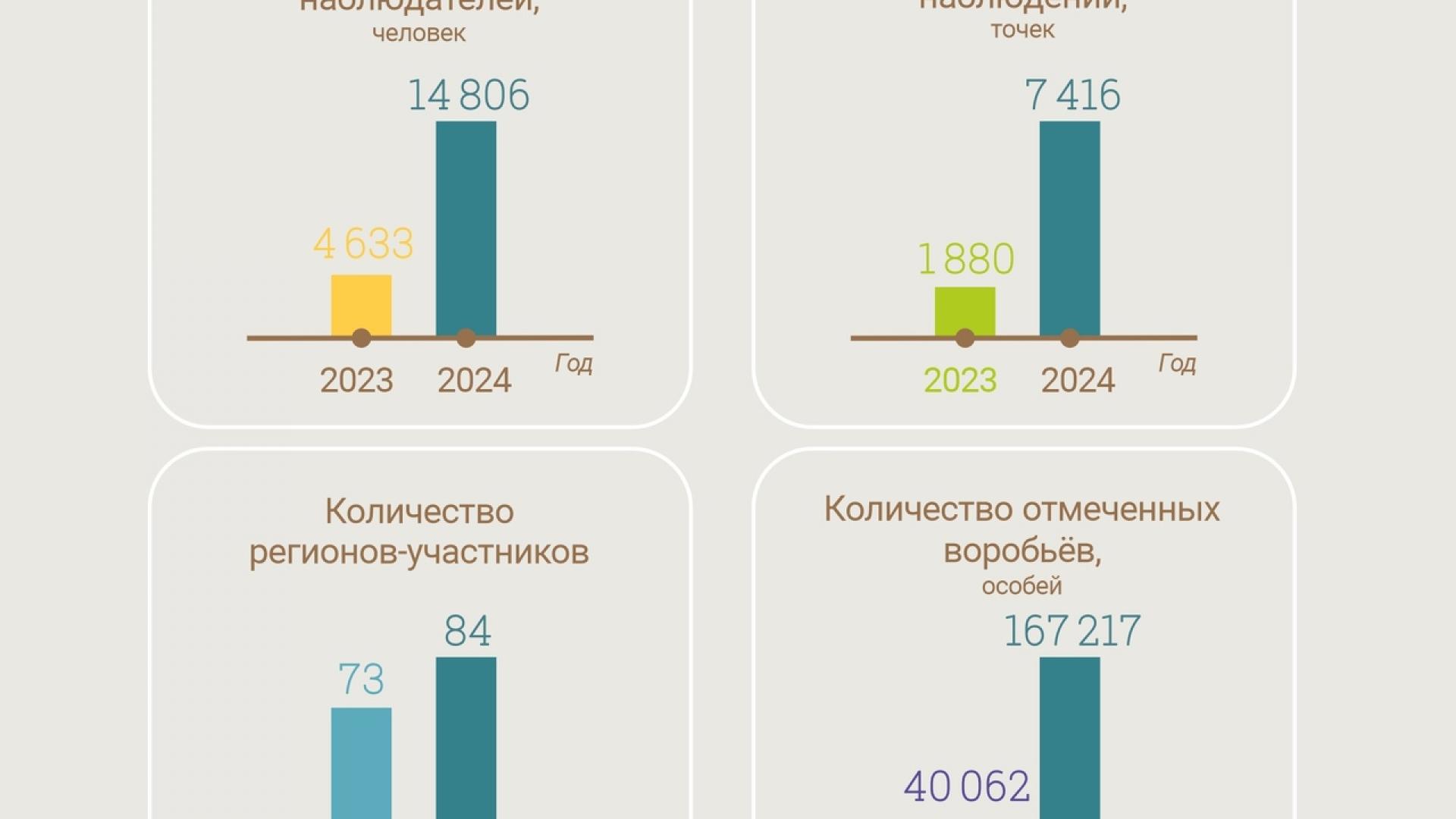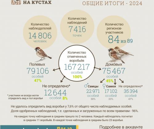 насчитав 3645 воробьёв. Лидером в учётах стали г. Москва (13351 особь), Иркутская