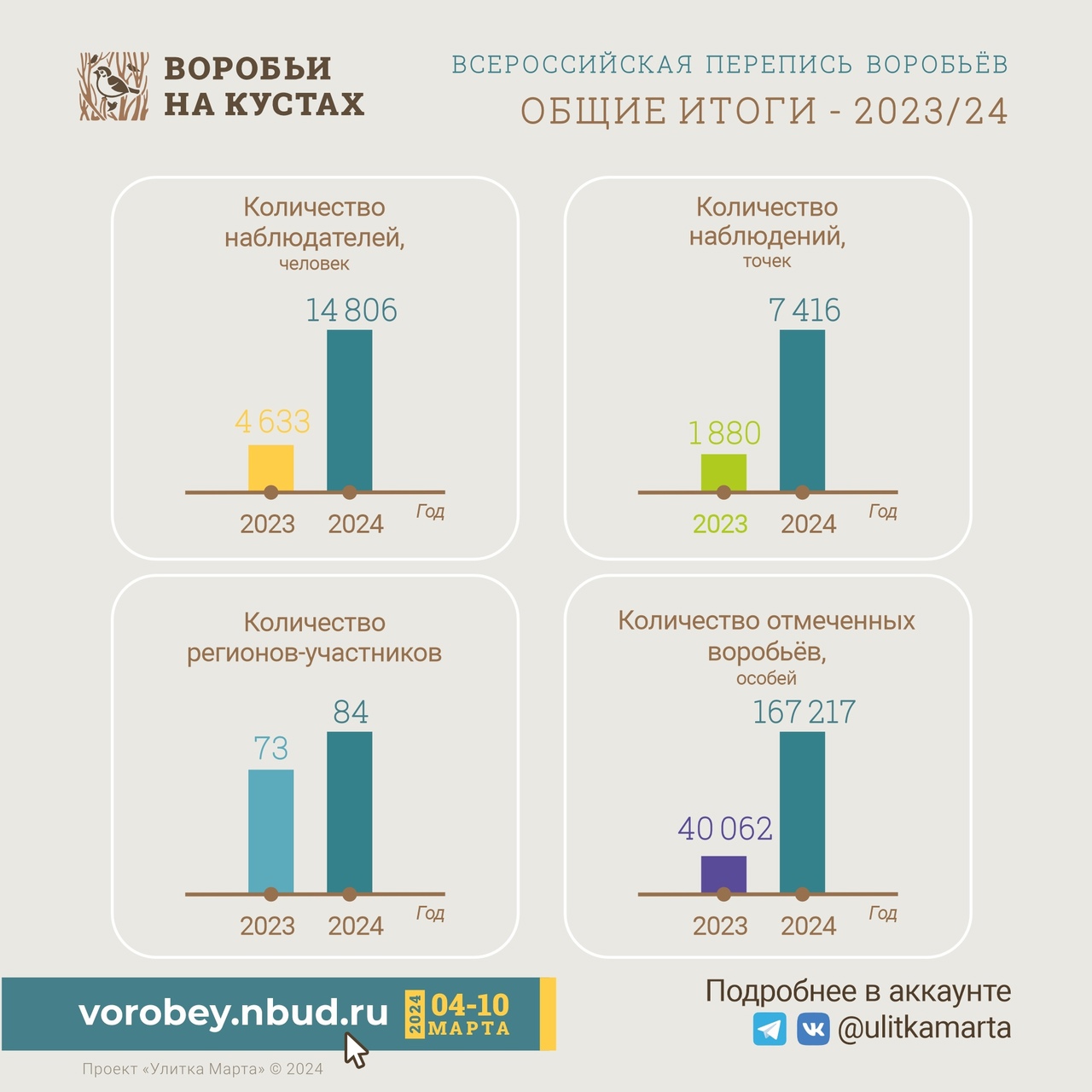 наблюдателей, а количество отмеченных воробьёв – в четыре раза до 1672017 особей.
