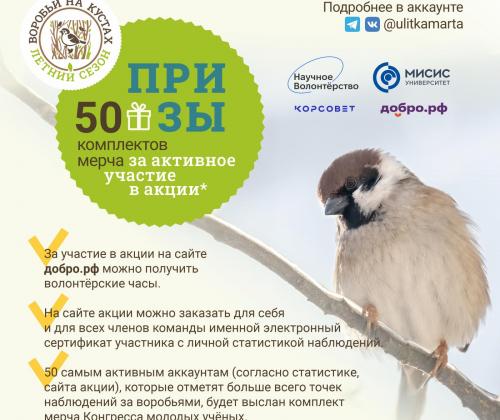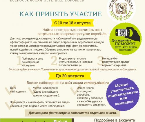 Всероссийская перепись воробьёв – это ежегодная эколого-просветительская акция для всех любителей природы. Она объединяет усилия учёных и натуралистов для обеспечения своевременного получения актуальных сведений о численности популяций полевого и домóвого воробья в России с целью недопущения сокращения численности, сохранения и восстановления этих видов. Мероприятие учит ответственности и еще раз обращает внимание, что даже самые обычные виды могут за короткий срок стать уязвимыми, а то и совсем исчезнуть из-за малодушия и халатных действий человека.